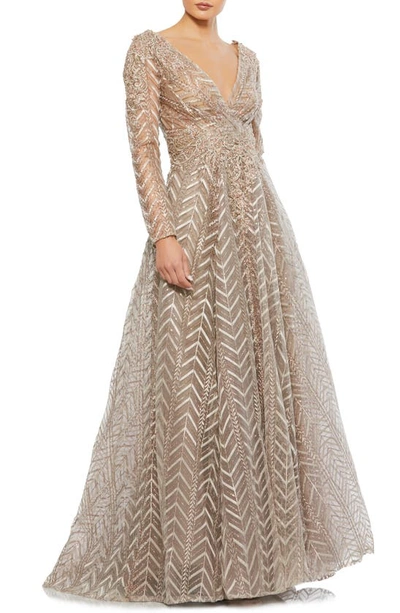 Embellished Long Sleeve Plunge Neck Trumpet Gown In Taupe