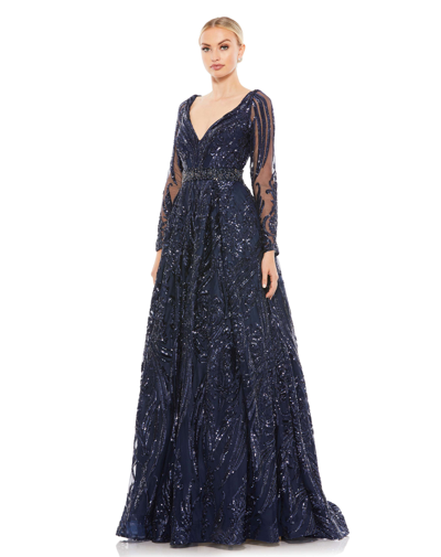 Sequined V Neck Illusion Sleeve A Line Gown In Black