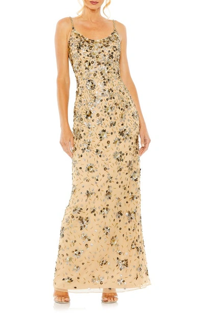 Floral Embellished Scoop Neck Evening Gown In Gold