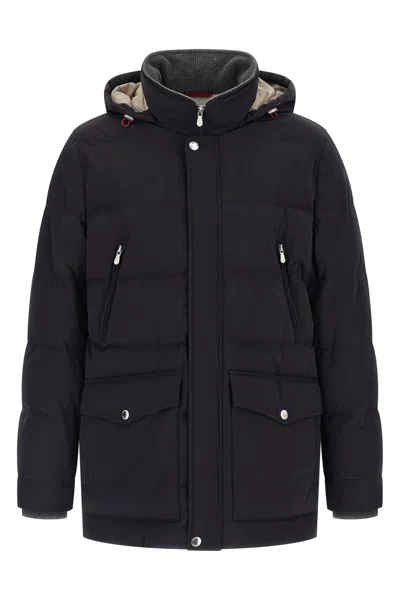 Hooded Down Jacket With Solomeo Inserts In Gray