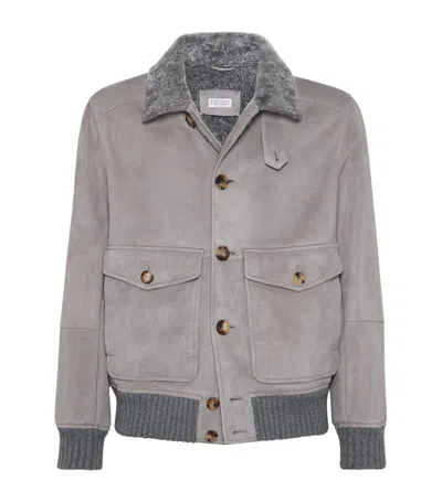 Suede Curly Shearling Bomber Jacket With Cashmere Knit Collar In Brown