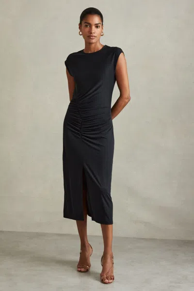 Charcoal Ruche Front Capped Sleeve Jersey Midi Dress