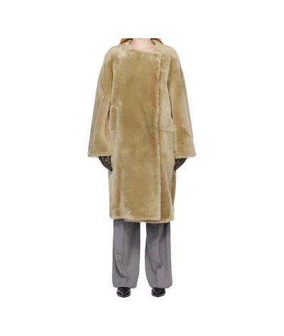 Beige Collarless Shearling Coat In Brown