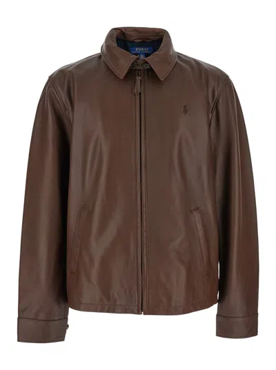 Brown Jacket With Classic Collar And Pony Embroidery On The Front In Leather Man In Burgundy