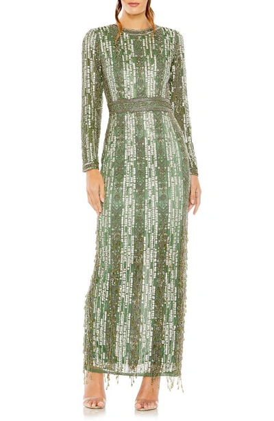Sequin Beaded Long Sleeve Gown In Sage