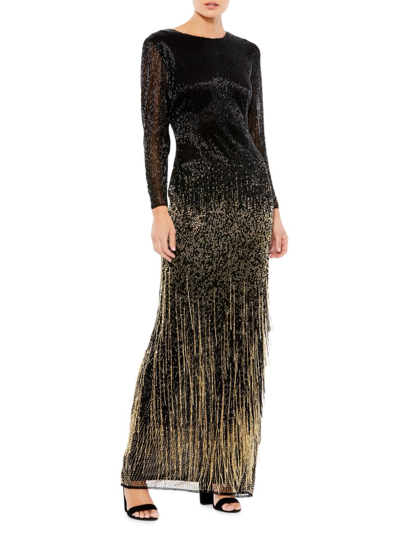 Long Sleeve Beaded Fringe Evening Gown In Black Gold