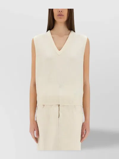 Wool V-neck Sleeveless Ribbed Hem Vest In Beige