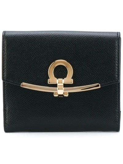 Hammered Leather Gold Gancini Compact Wallet In Black