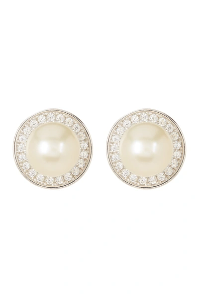 Silver Freshwater Pearl Cz Halo Stud Earrings In Metallic