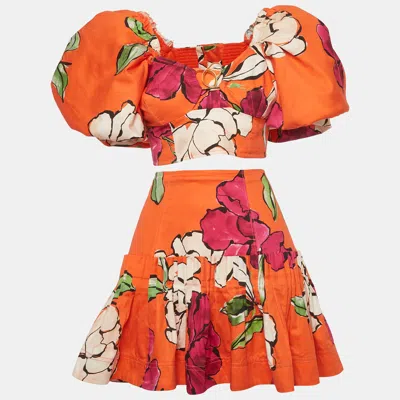 Pre-owned Orange Camellia Print Cotton Marcel Crop Top & Niki Skirt Set L