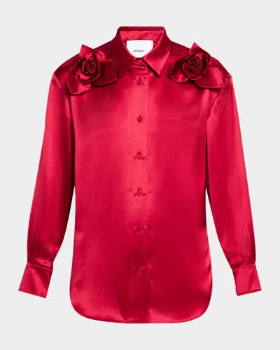Flor Satin Button-front Blouse With Roses In Poppy