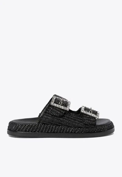Greta Crystal Buckle Raffia Sandals In Black