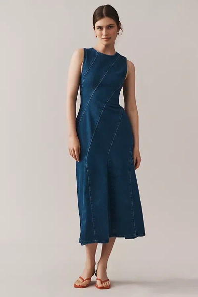 Raven Sleeveless Diagonal Seamed Denim Midi Dress In Blue