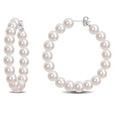 6-6.5mm Freshwater Cultured Pearl Hoop Earrings In Sterling Silver In White