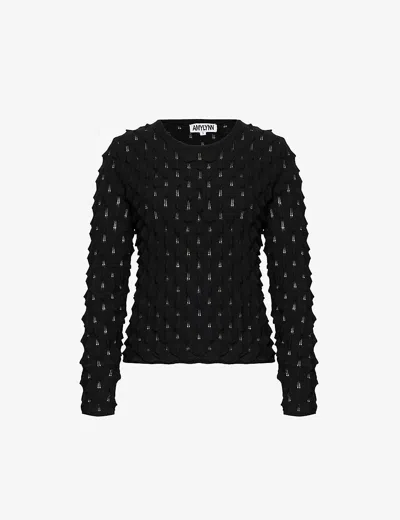 Womens Black Textured Round-neck Knitted Jumper
