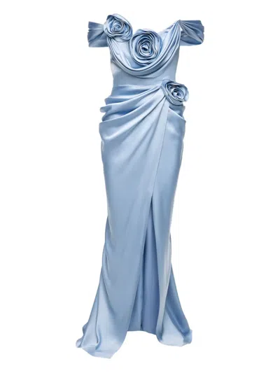 玫瑰缀饰露肩超长连衣裙