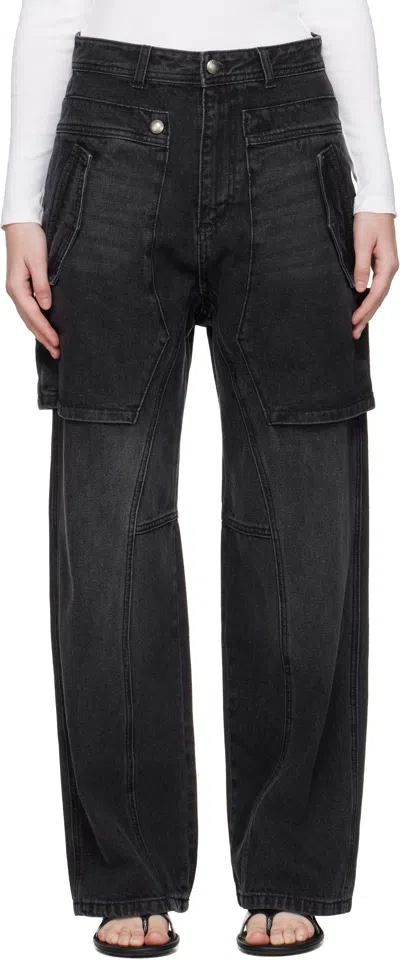 Black Flower Lace Attached Bootcut Jeans In Washed Black
