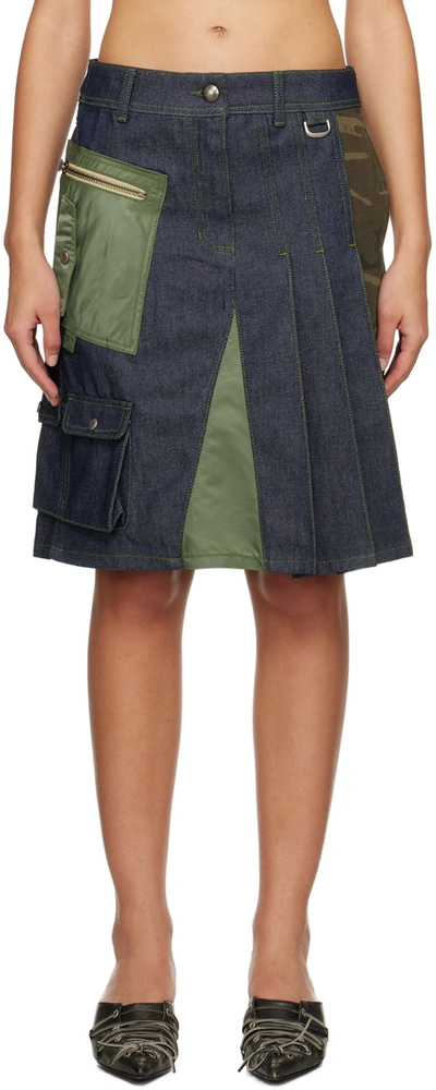 Blue Custom Flare Layered Denim Midi Skirt In Green