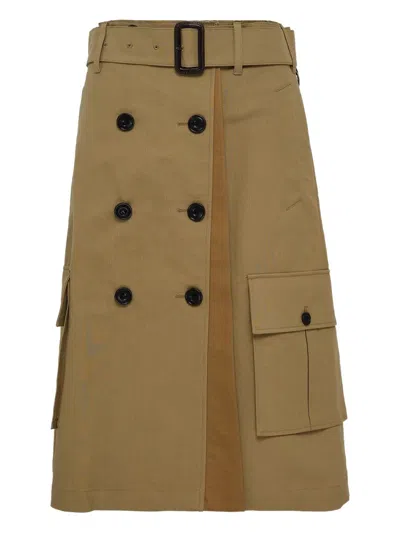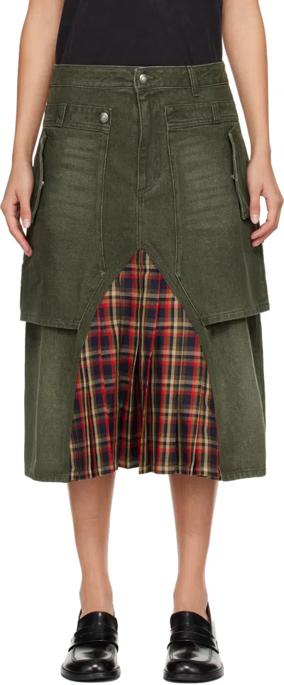 Khaki Raptor Layered Pleats Denim Midi Skirt In Green
