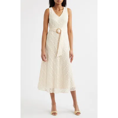 Embroidered Belted Sleeveless Midi Dress In White