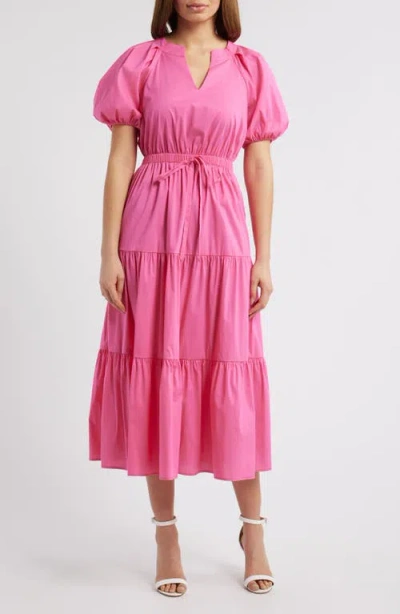 Tiered Puff Sleeve Midi Dress In Carmine Rose