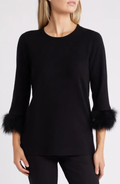 Womens Crewneck Feather Trim Cuff Sweater P Xxs 3x In Black