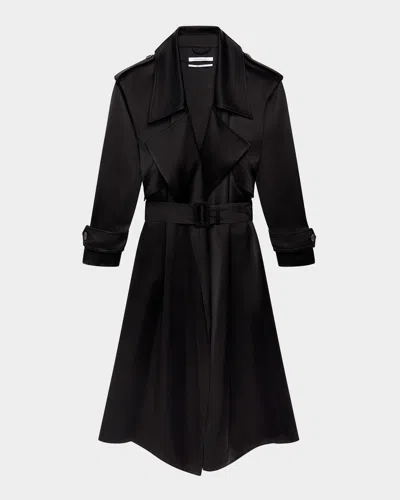 Soft Satin Belted Long Trench Coat In Black