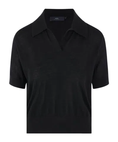 V-neck Knit Polo Shirt In Black