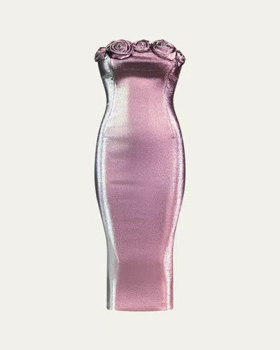 Strapless Lame Rosette Midi Dress In Pink Silver