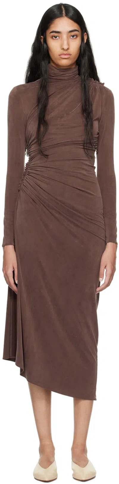 Brown Ruched Midi Dress In Cob Sepia