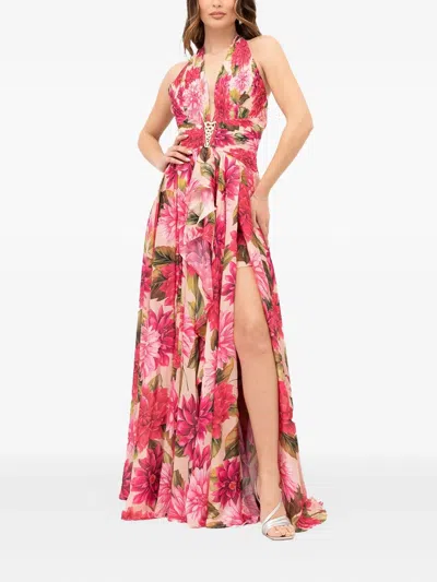 超长花卉印花挂脖连衣裙
