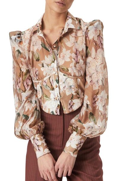 Amielie Floral Puff Sleeve Tie Neck Blouse In Apricot Floral