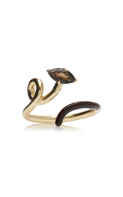 Half 9k Gold; Quartz; And Enamel Ring In Brown