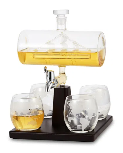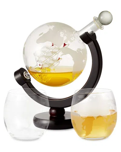 Globe Decanter With Handcrafted Glass Ship Inside & 2 Glasses In Transparent