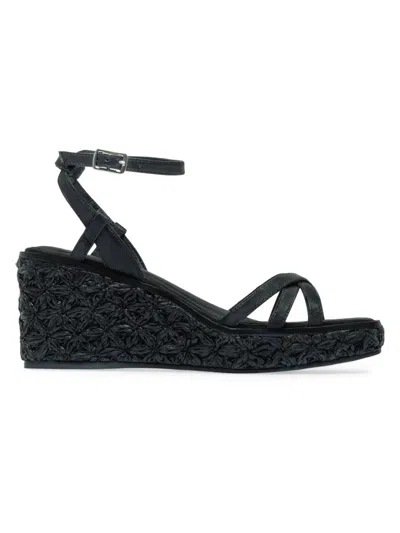 95mm Cairo Leather And Raffia Wedge Sandals In Black