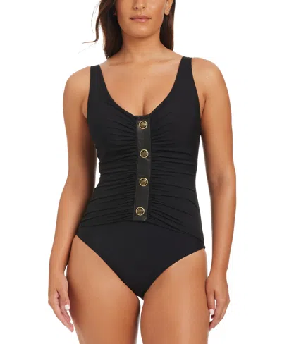 Women's Faux-leather V-neck One-piece Swimsuit In Black