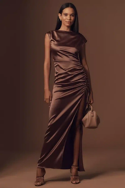 Francesca High-neck Stretch Satin Maxi Dress In Brown