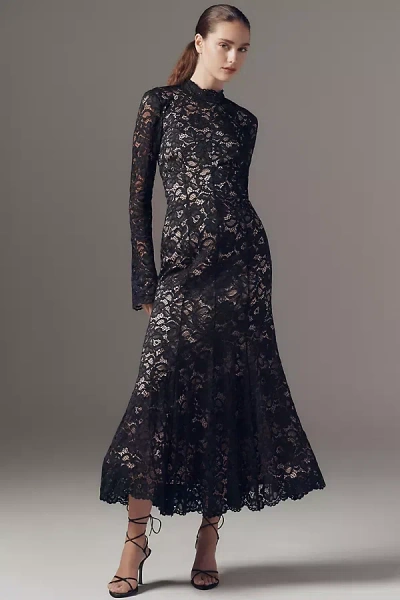 High-neck Long-sleeve Knit Midi Dress In Black