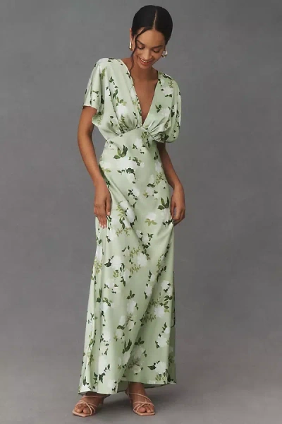 Leila Deep-v Flutter-sleeve Satin A-line Gown In Green