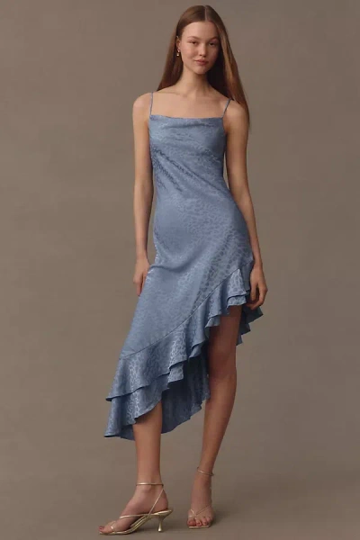 Mila Asymmetrical Cheetah Satin Ruffle Jacquard Midi Dress In Blue