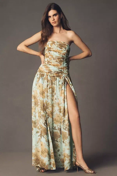 Kira Strapless Printed Satin A-line Maxi Dress In Green