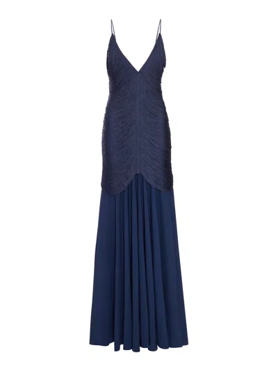 Long Nostalgia Dress With Fringes And V-neck In Blue