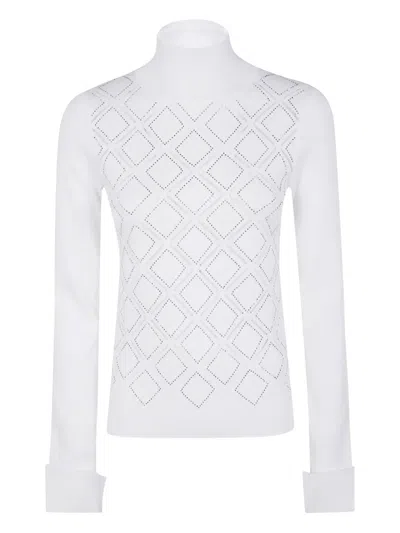 Rhombus Pattern High Neck Sweater With Crystal Embellishment In White