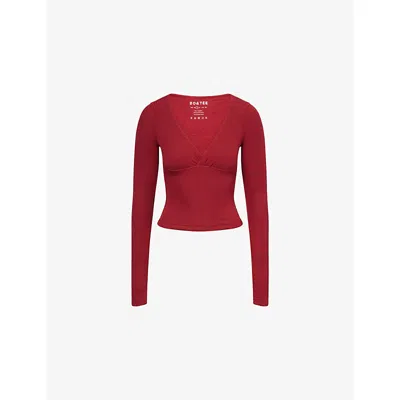 Womens Burgundy Ribbed V-neck Stretch-woven Top Xs In Red