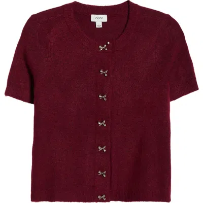 Short Sleeve Bow Button Cardigan In Burgundy