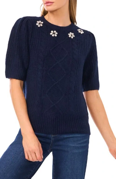 Faux Jewel Embellished Cable Puff Sleeve Sweater In Blue