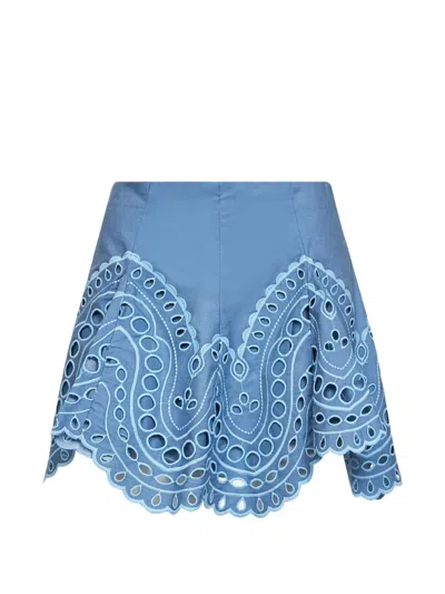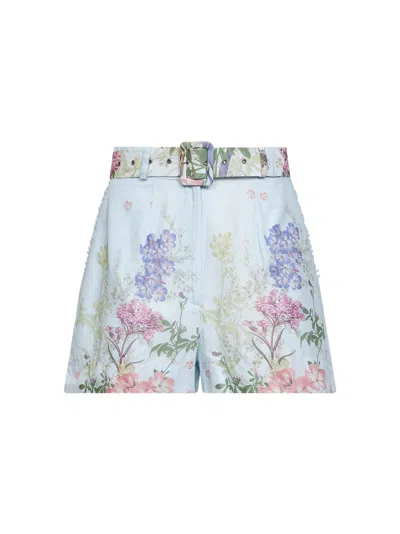 Light Blue Printed Cotton Blend Pansy Belted Shorts