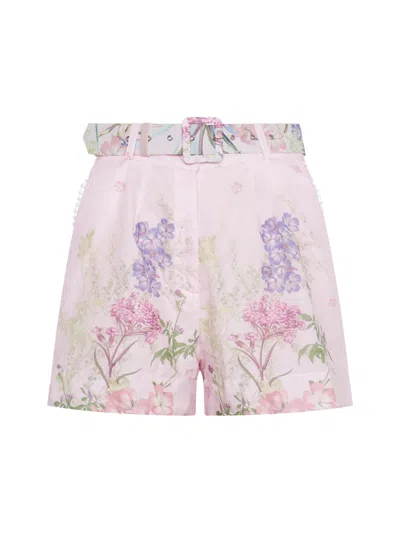 Cream Printed Cotton Blend Pansy Belted Shorts In Multi