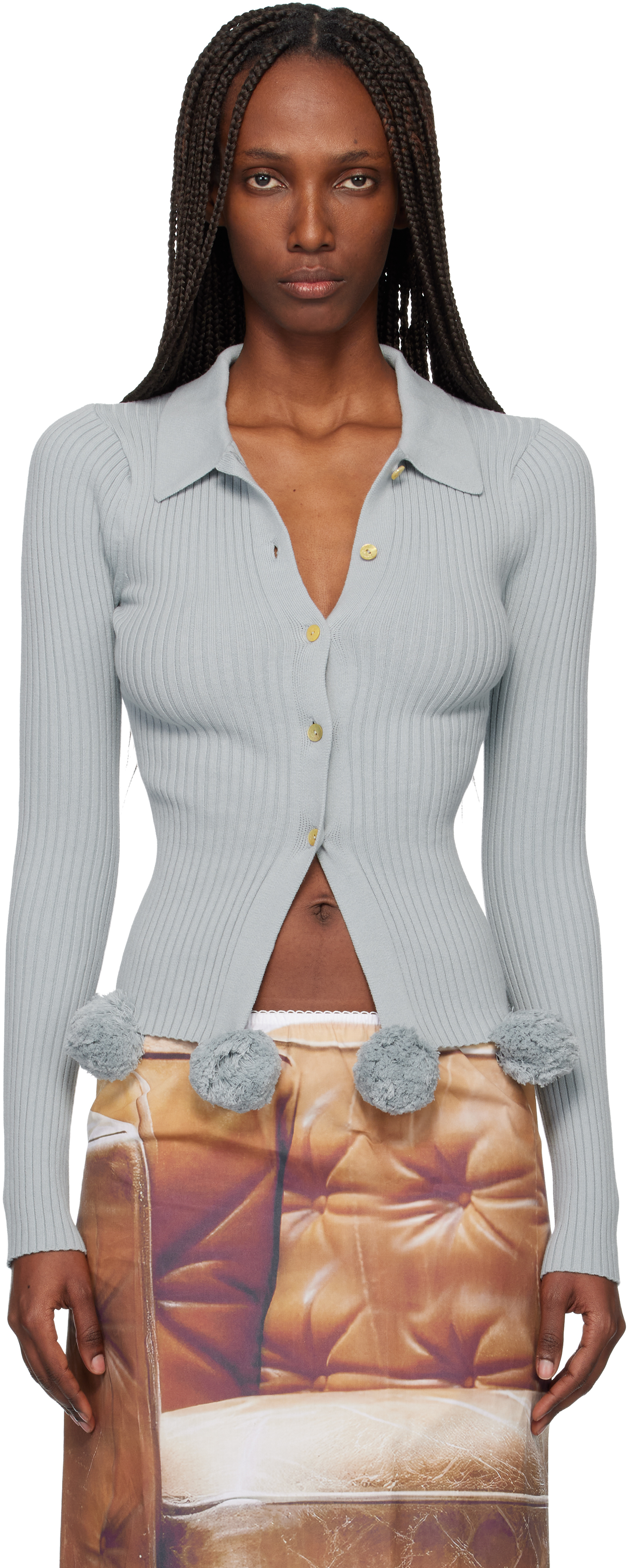 Blue Pom Pom Cardigan In Gray