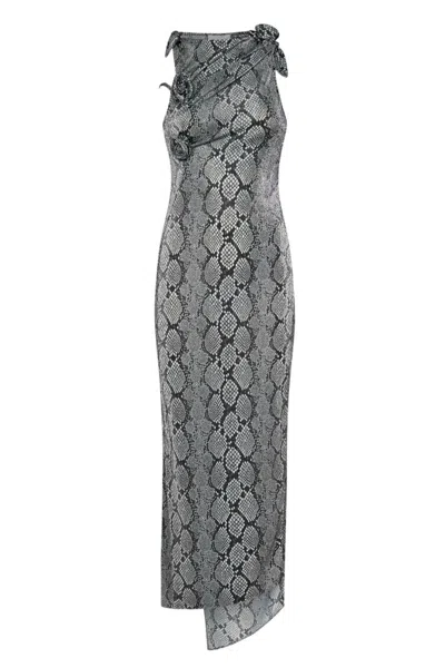 Snakeskin Print Lamé Dress With Floral Appliqué In Grey